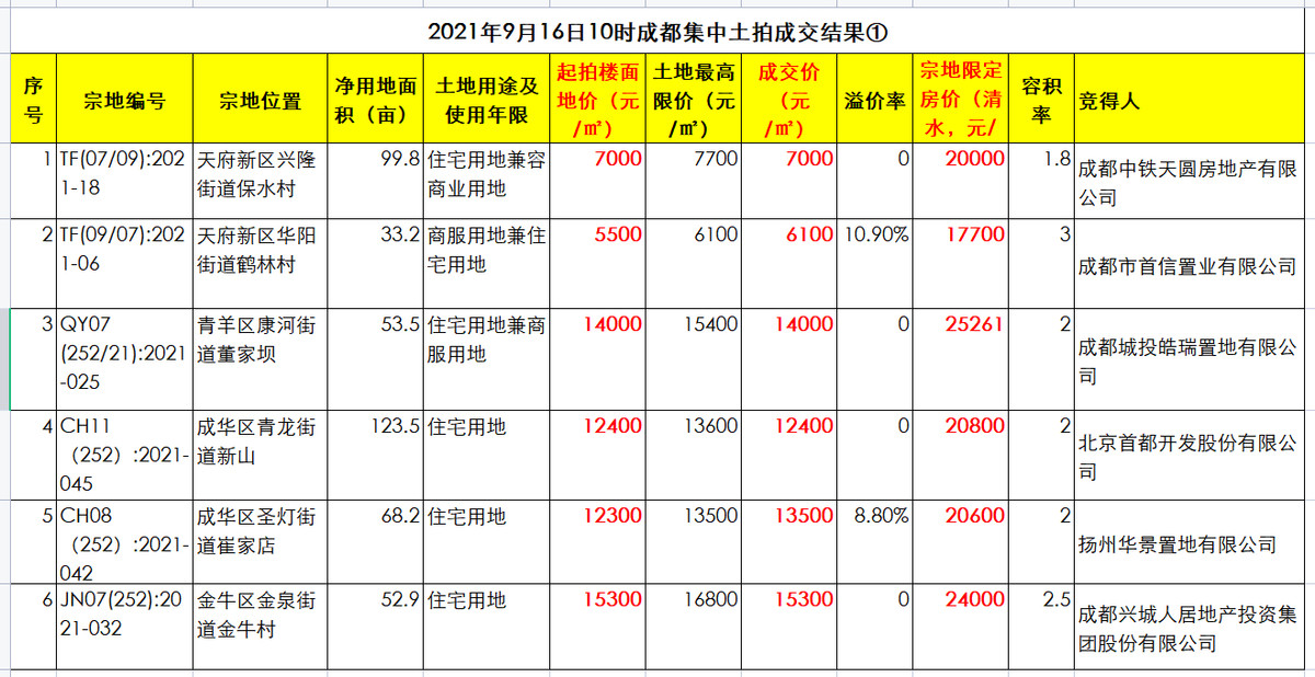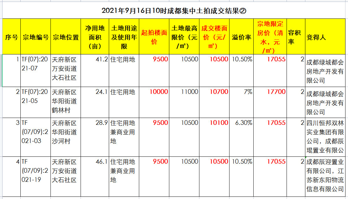 除了天府新区的亮点外,成华区崔家店68亩地块也成为热点地块,被扬州华景置地有限公司以宗地最高限价13500元/㎡拿下,销售型人才公寓面积占比37%。另三宗来自成华区、金牛区的地块则均以底价成交。上午土拍具体成交结果可见下表。