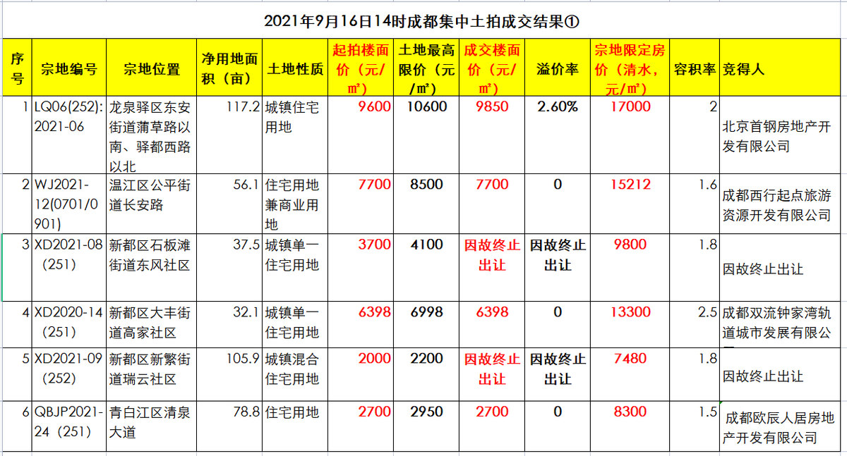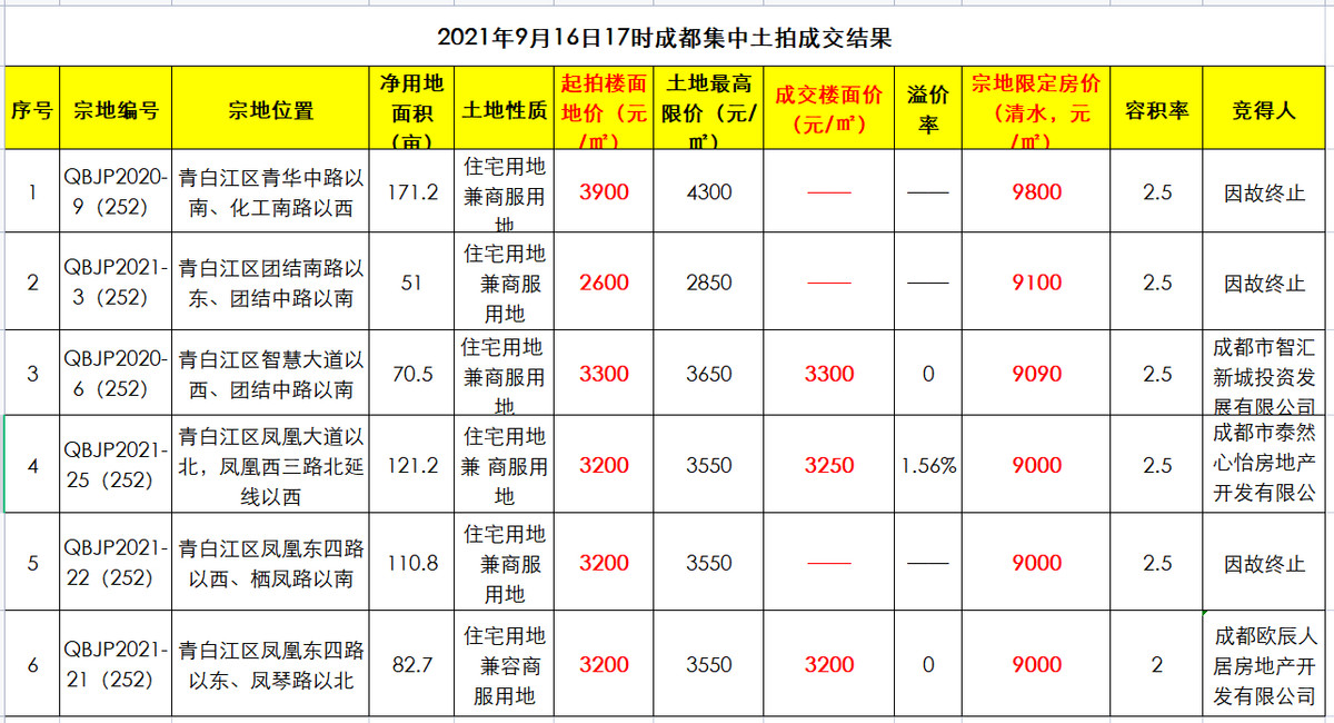 按照8月24日出让公告,今天原计划共有28宗地出让,9月14日公告显示今天拍卖的6宗地因故终止,包括成华区1宗,新都区2宗和青白江区3宗。