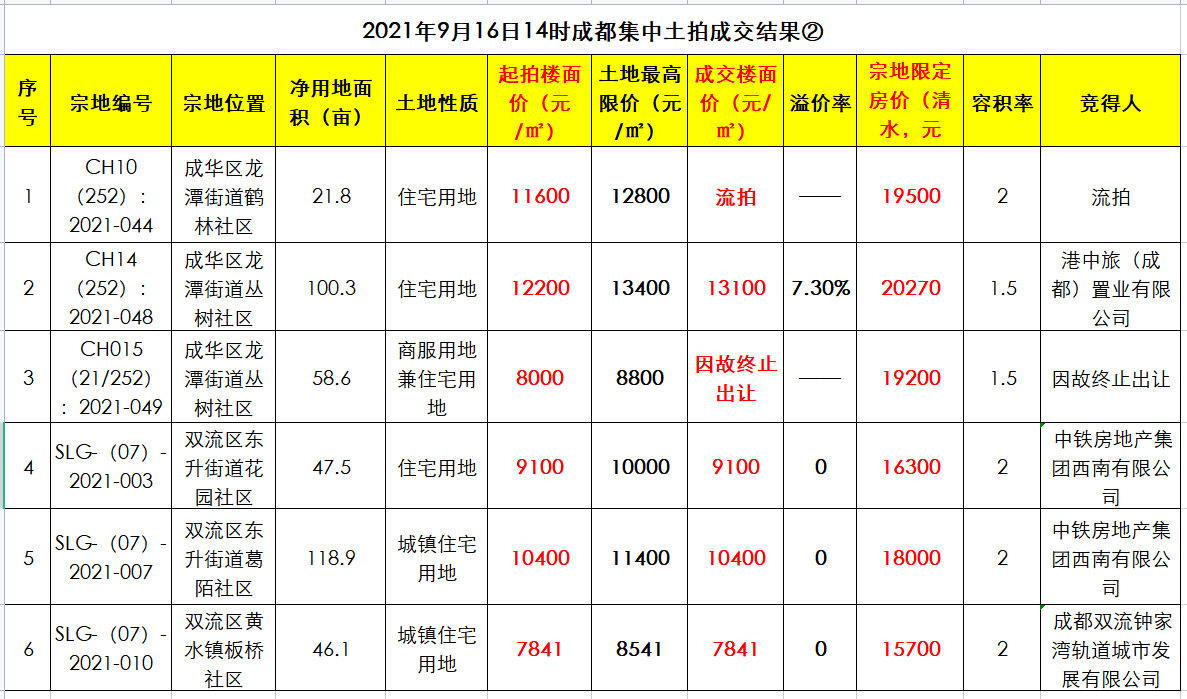 从成交结果来看,这一场次土拍显得颇为安静,其中仅龙泉驿区东安117亩地块和成华区龙潭街道100亩地块2宗地分别被北京首钢和港中旅(成都)置业溢价拿下,成华区龙潭街道21亩宗地则尴尬流拍,其余6宗地块均底价成交。