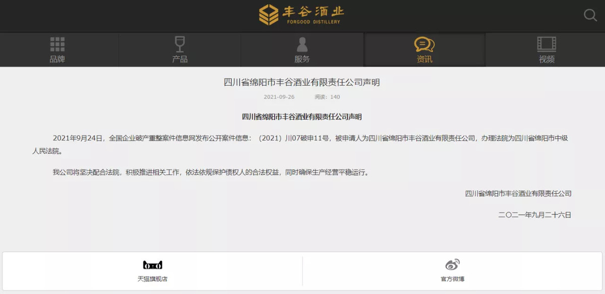 9月26日,丰谷酒业正式向社会发布《四川省绵阳市丰谷酒业有限责任公司声明》。《声明》显示:2021年9月24日,全国企业破产重整案件信息网发布公开案件信息:(2021)川07破申11号,被申请人为四川省绵阳市丰谷酒业有限责任公司,办理法院为四川省绵阳市中级人民法院。