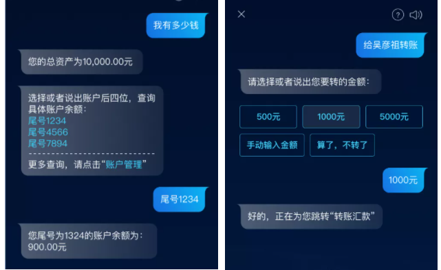7月手机银行升级了原有的语音交互服务,可以和您“对话”啦!您可以问“我有多少钱”“我的信用卡账单”“我的交易明细”“我XXXX尾号卡的余额”……手机银行都可以回答。您还可以告诉手机银行“我要转账”,说出收款人的姓名、账户、转账金额等信息,手机银行就会自动把这些内容直接填写到转账页面,进而完成转账。