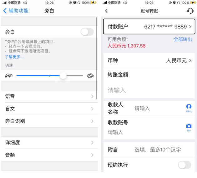 屏幕朗读是为了视力障碍人群便利使用手机银行服务,专门开发的功能。账户管理、转账、理财、话费充值、收支记录、资产管理等常用功能都支持屏幕朗读。当苹果手机用户打开系统的辅助功能“旁白”,安卓手机用户打开“TalkBack”功能时,手机银行可以按照从上到下,从左到右的顺序顺畅的朗读页面内容,并支持进行点击、输入、提交等操作。