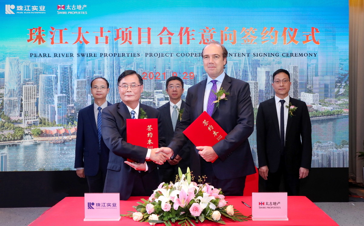 珠江实业董事长高东旺(前排左)及太古地产行政总裁彭国邦(前排右)签署合作意向,计划携手在粤港澳大湾区广州市荔湾区聚龙湾片区打造珠江太古商业项目。