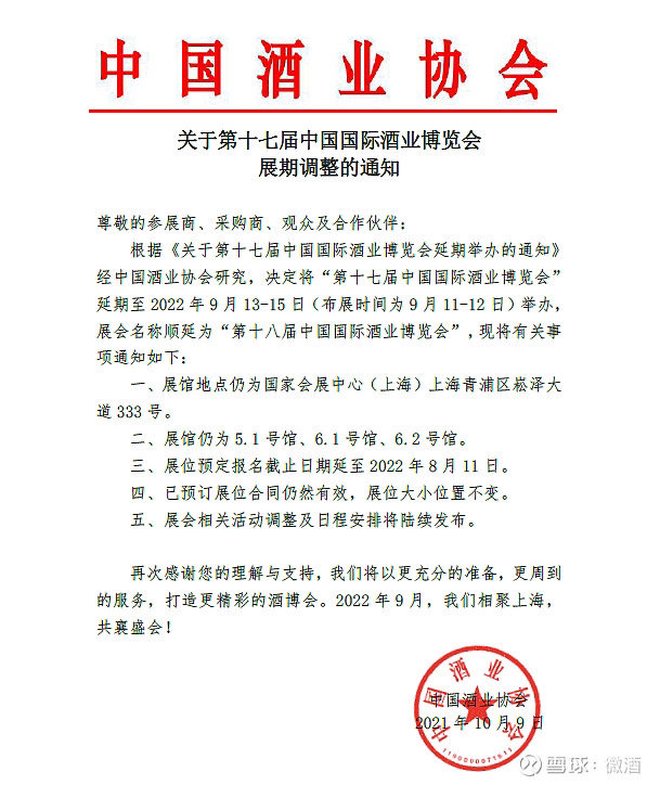 10月10日,中国酒业协会CADA发布《关于第十七届中国国际酒业博览会展期调整的通知》。通知提到,根据《关于第十七届中国国际酒业博览会延期举办的通知》经中国酒业协会研究,决定将“第十七届中国国际酒业博览会”延期至2022年9月13-15日(布展时间为9月11-12日)举办。