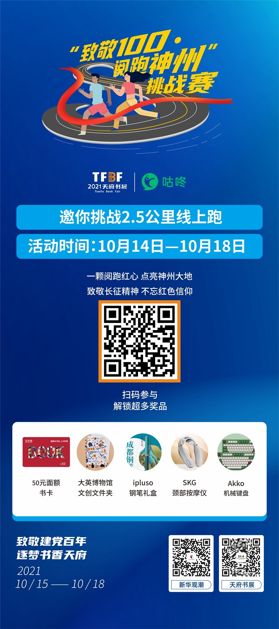 走过两届的天府书展已成为在全国具有一定影响力的品牌书展活动,成功塑造“行业盛会”和“阅读嘉年华”的品牌形象。突破传统圈层,触及多样广泛的人群,天府书展一直通过各种渠道向大众传递阅读的力量。这一点与全国最大运动社交平台咕咚的发展理念不谋而合,作为拥有2亿注册用户的运动社交软件,咕咚一直在跨界合作的道路上不停“奔跑”。去年天府书展和咕咚举办的线上跑挑战赛在互联网上掀起参与热潮,收获无数好评。今年,天府书展和咕咚持续围绕“阅读+运动”联合跨界,鼓励参与者通过活动发掘阅读与运动的联系,在“读”与“行”之间发现美好,打开生活新视界;更策应“致敬建党百年逐梦天府书展”的书展年度主题,以2.5公里的挑战门槛致敬长征精神,不忘艰苦奋斗。