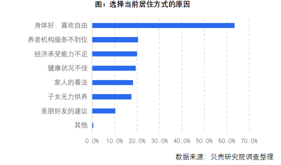 居家养老仍是中国老年人首选。报告显示,44.5%的老年人倾向住在普通居民小区,他们能够从社区参与中获得最大化养老需求和心理满足。而高龄老年人对专业养老服务的需求更高,他们更需要专业化的服务与照料,在80岁及以上高龄群体中33.2%倾向于住在专业养老公寓。