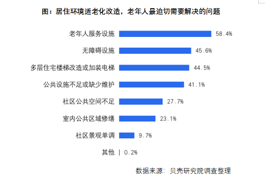 居住环境适老化改造已成为存量更新重要议程。调研发现,增配老年人服务设施需求最为迫切。社区改造需提供多样化活动场所,满足老年群体的精神需求和价值实现需要;其次安装无障碍设施,比如室内空间加装扶手、社区内部安装指示灯等;44.5%的老年人迫切希望对多层住宅楼梯进行改造或家装电梯。公共设施不足或缺少维护、社区公共空间不足、室内公共区域修缮等也是老年人反映需要改造的问题。