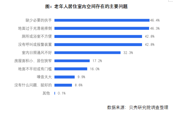 社区软硬件建设不适应老龄化发展趋势,室内安全性问题是摆在居家养老老年人面前的痛点之一。调查显示,46.4%的老年人认为室内居住空间缺少必要扶手,46.3%认为室内地面光滑易摔,42.8%认为厕所或浴室不便,42.8%表示室内未安装呼叫或报警装置。部分老年群体也面临居住空间舒适性不足问题,表现在室内日照通风不好、室内居住狭窄等。