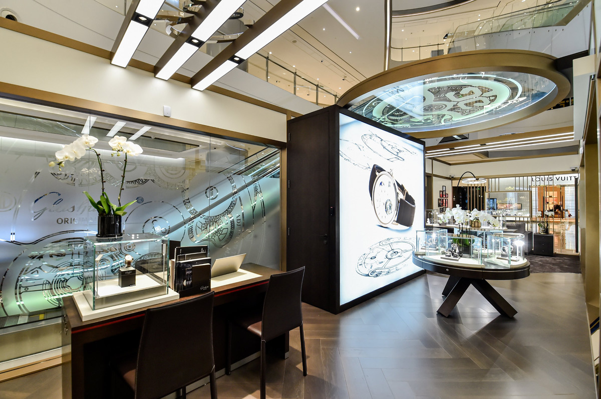 格拉苏蒂原创成都IFS概念店采取了全新的整体设计风格,与其在北京、上海等地的门店风格大不一样。其将德国经典风格元素与现代时尚的创新装饰艺术元素进行糅合,品牌最具代表性的双G标识机芯模型,在吊顶位置成为视线的焦点,整个“长廊”空间让人眼前一亮。