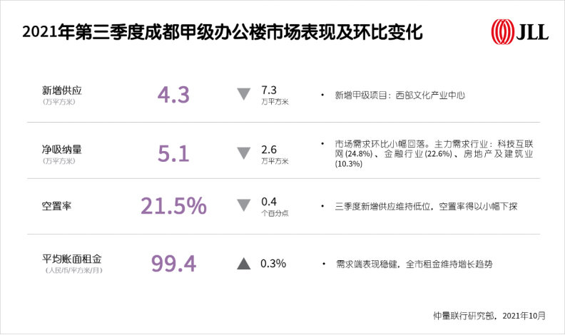 近日,仲量联行《2021年第三季度成都商业及物流地产市场报告》(以下简称《报告》)发布,在刚刚过去的第三季度,成都办公楼租赁市场情况如何呢?受“双减”政策影响,教育行业业务收缩是否导致办公面积缩减呢?一起来看看市场报告解读。