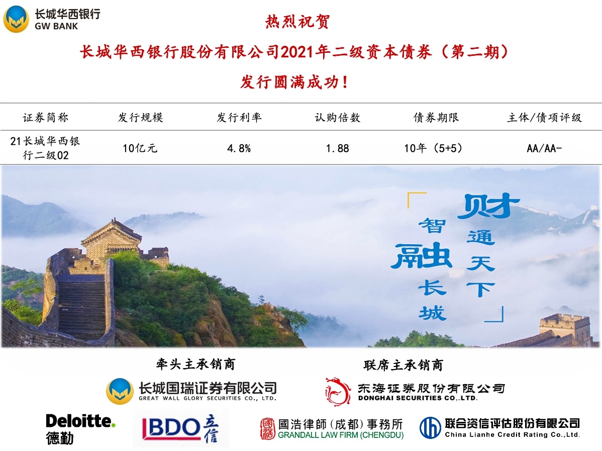 10月25日,长城华西银行通过银行间债券市场再次成功发行2021年(第二期)二级资本债券,为本年度第二次发行。本期二级发行规模10亿元,期限5+5年,发行利率4.8%,最终全场认购倍数1.88倍。此次债券发行,继续保持了全市场同评级较低利率,且认购倍数高于第一期,获得了广大投资者和市场的认可。