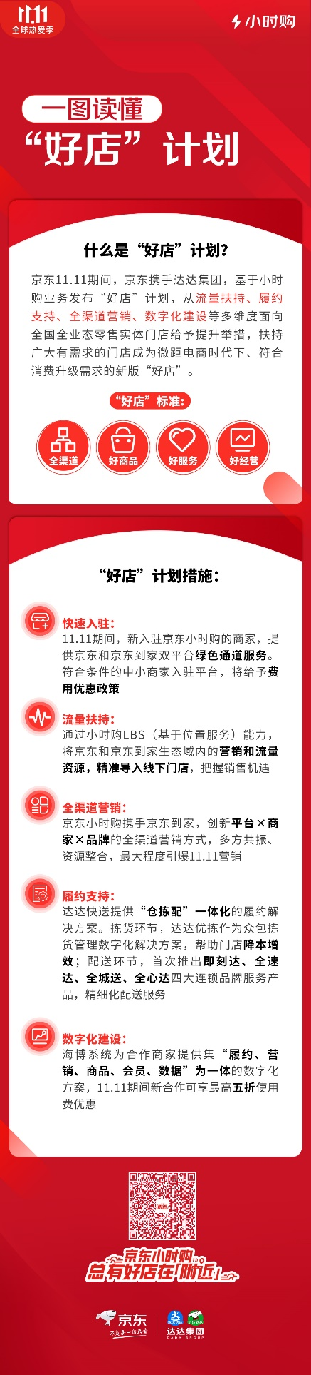“好店计划”具体扶持举措包括:“双11”期间新入驻“小时购”的商家,将享受京东和京东到家双平台绿色通道快速服务,符合条件的中小商家还将给予费用优惠。