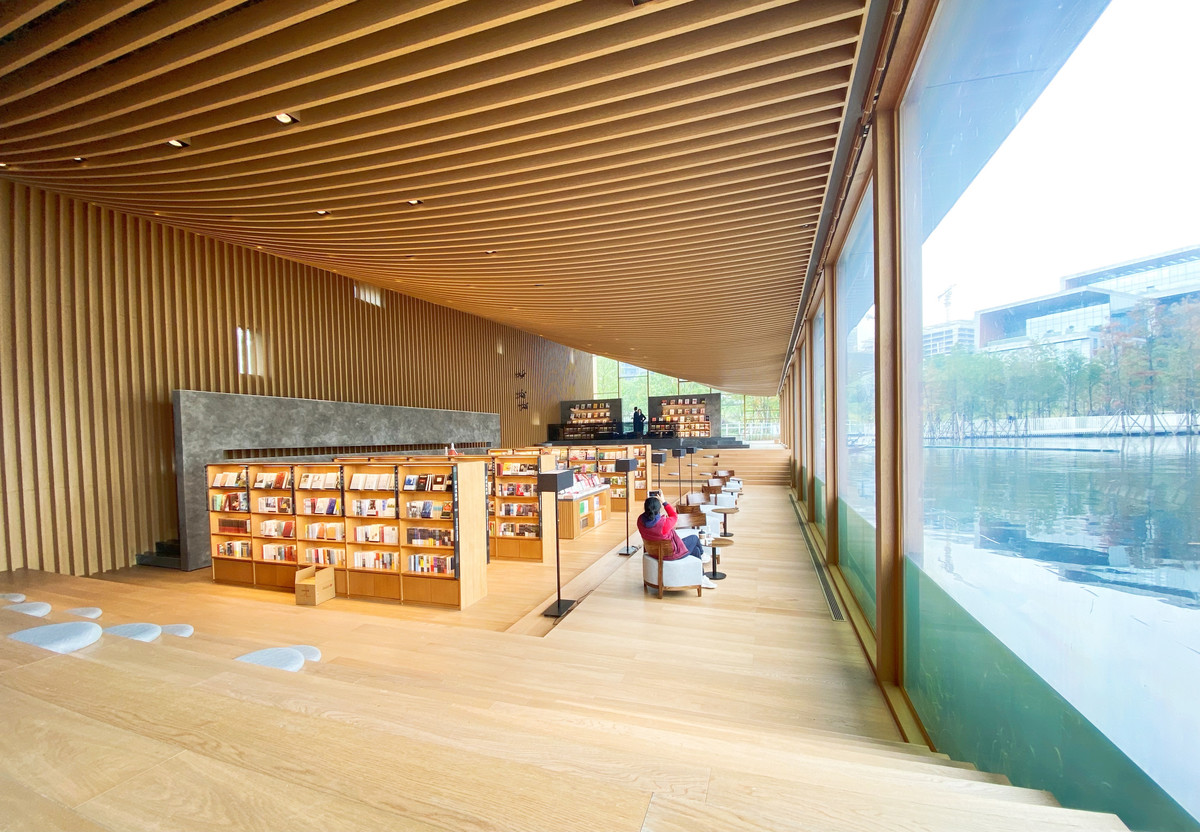 四川在线在现场看到,中信书店(成都兴隆湖店)直接坐落于水中。透过书店的玻璃幕墙可见兴隆湖碧绿的“水下世界”。书店分成六个区域:艺术展览区部分、阅读区部分、咖啡餐饮区、冥想区、多功能厅及后勤管理部分。整体空间材质以橡木为主,颇有质感,氛围静谧安宁。