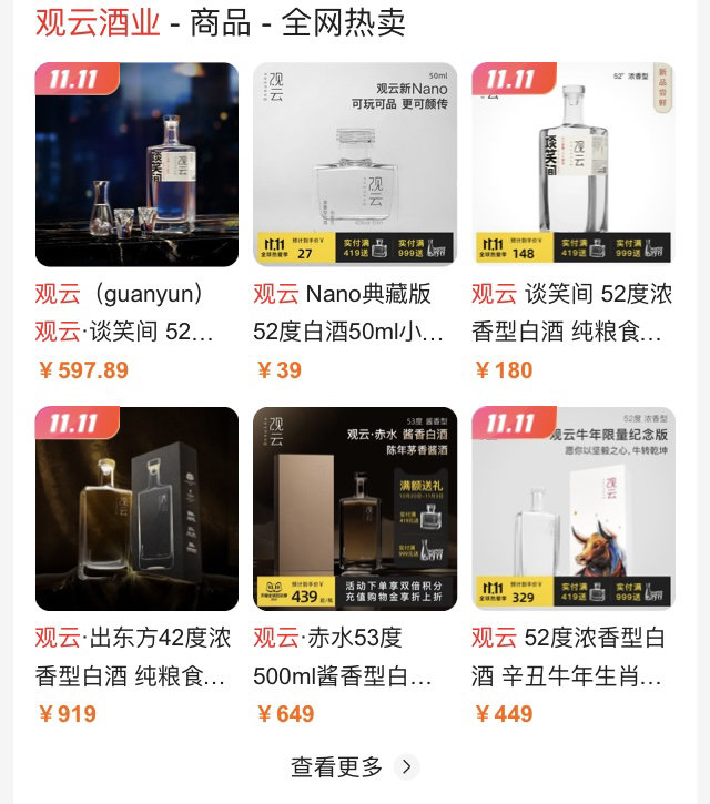 资料显示,观云白酒于2015年正式推出,2018年获得4200万A轮融资进入快速发展阶段。四川在线记者从某电商平台观云自营店看到,目前其在售产品超过十款包括多个系列,涵盖300元、700元、1000元及1500元以上价位段。
