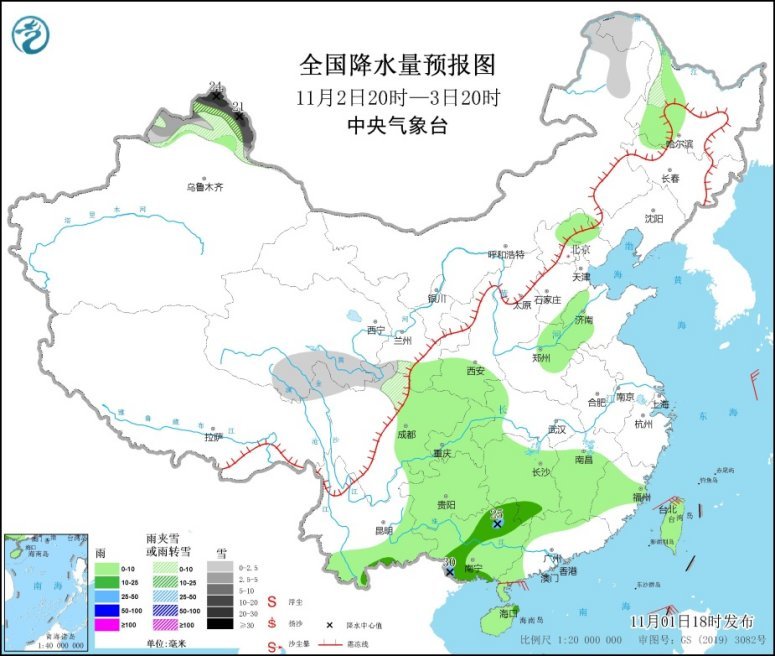 11月2日20时至3日20时,内蒙古东北部、黑龙江西北部、新疆北疆北部和北疆东部、青海南部、甘肃南部、川西高原北部等地部分地区有小到中雪,其中,新疆北疆北部和北疆东部等地部分地区有大到暴雪,局地大暴雪(20~24毫米)。黑龙江西南部、西北地区东南部、华北北部、黄淮东部和西部、江汉西部、江南大部、西南地区东部、云南南部、华南大部、台湾岛等地部分地区有小到中雨,其中,广西西南部和东北部等地部分地区有大雨(25~30毫米)。