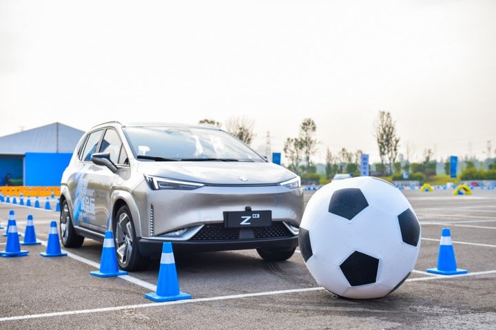 在接下来的极速射门和绕桩突围环节中,电车重心低带来的驾控优势在合创Z03上获得体现。合创Z03在弯道的支撑性以及循迹性都十分不错。