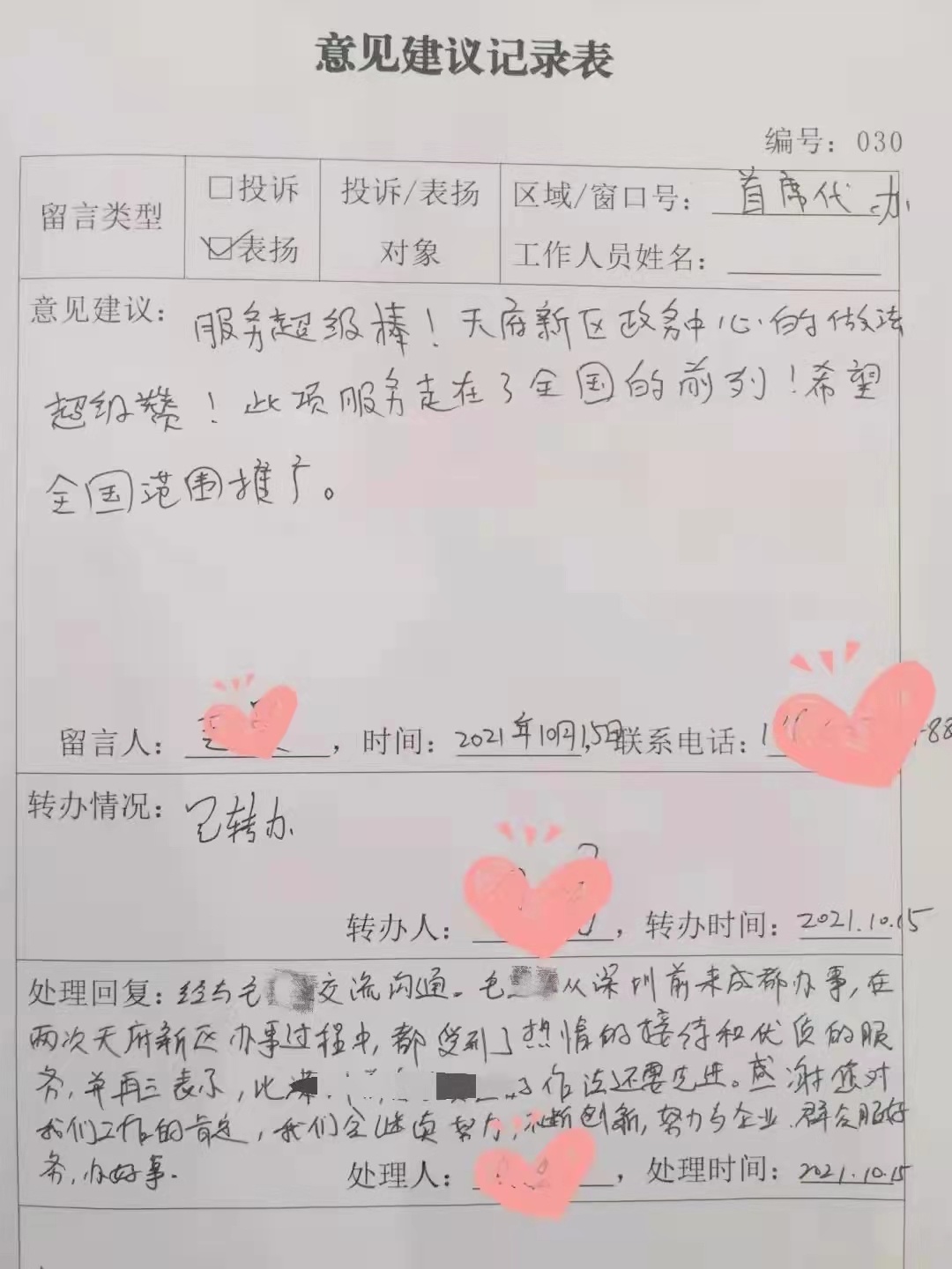 “服务超级棒!天府新区政务中心的做法超级赞!此项服务走在了全国的前列!”在天府新区政务服务中心咨询台意见建议簿上,从深圳前来办事的毛女士这样点赞。让她感叹的正是全新推出的首席代办服务。