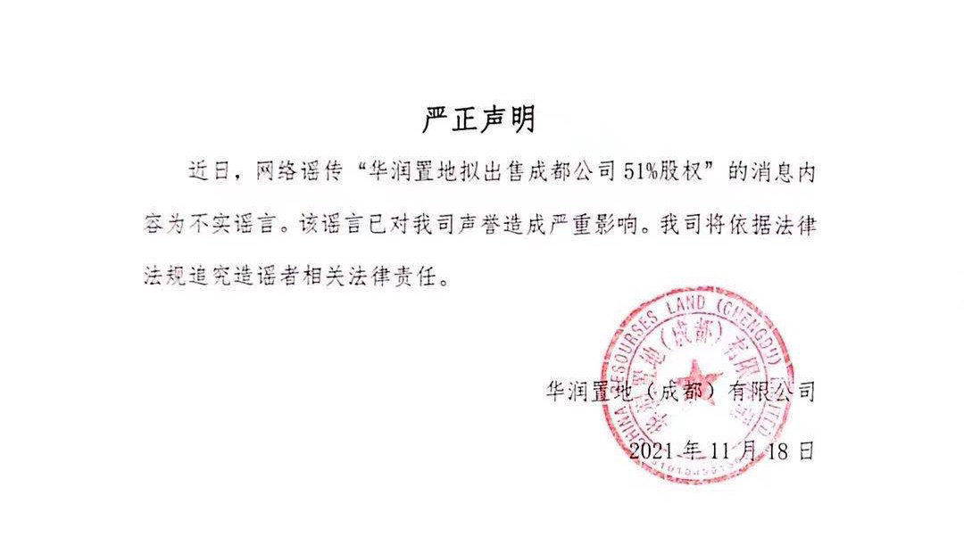 11月18日晚,针对网传“成都锦兴华润置地拟出售成都公司51%股权”消息,华润置地成都公司发布声明。声明指出,近日网络谣传“华润置地拟出售成都公司51%股权”的消息内容为不实谣言,该谣言已对华润置地成都公司声誉造成严重影响,华润置地成都公司将依据法律法规追究造谣者相关法律责任。