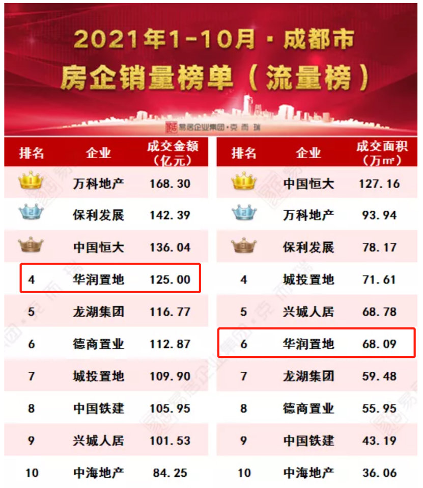 目前,华润置地成都公司运营情况良好,发展势头强劲,在成都有5个主力项目在售,2个新项目待售。在克而瑞日前发布的2021年1-10月成都市房地产企业销售业绩榜单中,华润置地在成都市场前10个月完成125亿元的销售业绩,位列第四,销售面积为68.09万㎡,排名第六。