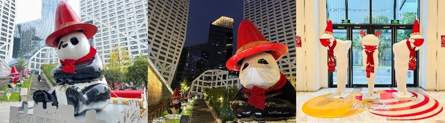 成都来福士广场“熊猫一家”集体换装,戴上红色圣诞帽和红围巾,扮相呆萌的熊猫爸爸拉着雪橇车打头阵,仿佛满载一车礼物从二楼水景平台朝市区街头驶去,要将圣诞的惊喜与欢乐带给广大市民。办公楼大堂由艺术家高孝午创作的《后标准时代》三座雕塑也纷纷变装,头顶圣诞帽和麋鹿角,脖系雪花围巾、同时还不忘戴上红色定制款熊猫口罩,温馨提醒大家疫情防控不放松,来福士圣诞暖心护航。