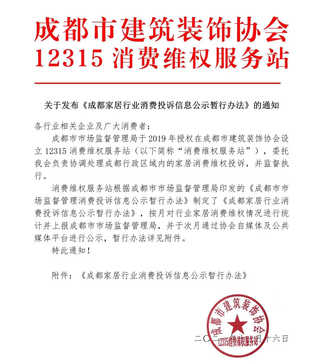 据悉,成都市市场监督管理局于2019年在成都市建筑装饰协会设立12315消费维权服务站,委托协会负责协调处理成都行政区域内的家居消费维权投诉,并监督执行。根据成都市市场监督管理局印发的《成都市市场监督管理消费投诉信息公示暂行办法》,服务站日前制定了《成都家居行业消费投诉信息公示暂行办法》,将按月对行业家居消费维权情况进行统计并上报成都市市场监督管理局,并于次月通过协会自媒体及公共媒体平台进行公示。