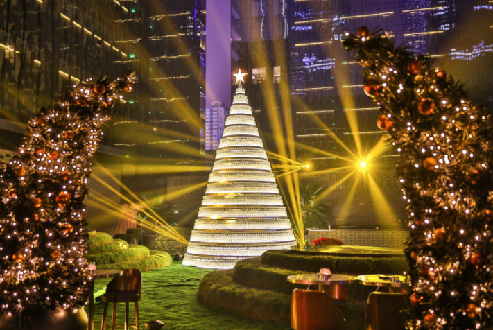 据介绍,在过去的几年里,博舍持续由回收材料创造出独具特色的圣诞树。今年这棵7米的晶莹剔透的圣诞树,采用了从博舍客房内回收的近万只饮用水玻璃瓶。节日过后,这些玻璃瓶将由玻璃回收处理场再次回收。