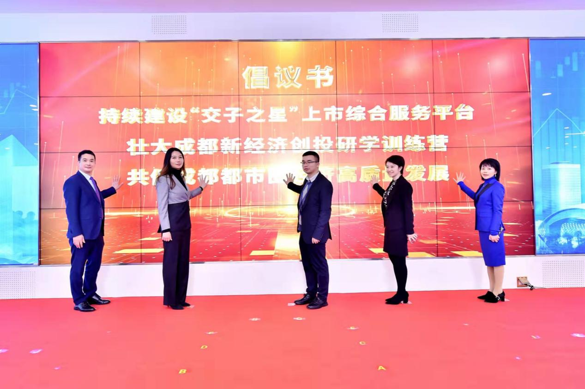 在敲钟仪式结束后,作为成都上市企业、金融机构、行业组织等各类市场主体的代表,成都金融业联合会、成德眉资“金融顾问”服务团、国金证券、民生银行、观想科技、纵横股份的嘉宾,共同发布了《持续建设“交子之星”上市综合服务平台 壮大成都新经济创投研学训练营 共促成都都市圈经济高质量发展的倡议》。