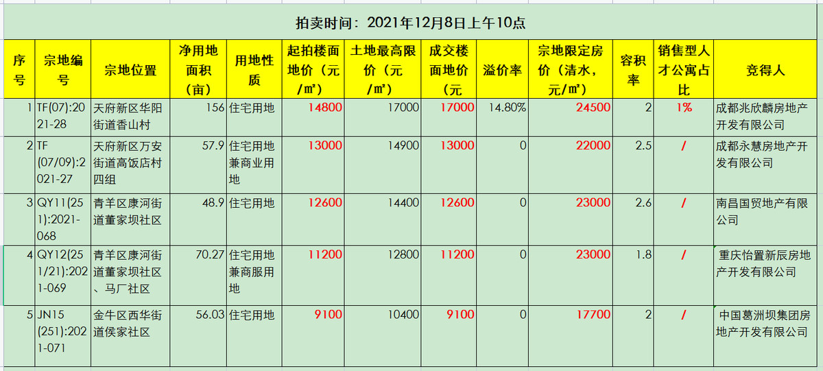 今日(12月8日)拍卖继续,上午十点,由天府新区、青羊区和金牛区供应的5宗土地准时开拍,合计面积约390亩,最终5宗地全部成交,除天府新区156亩地块溢价成交外,其余四宗地块均以底价成交。