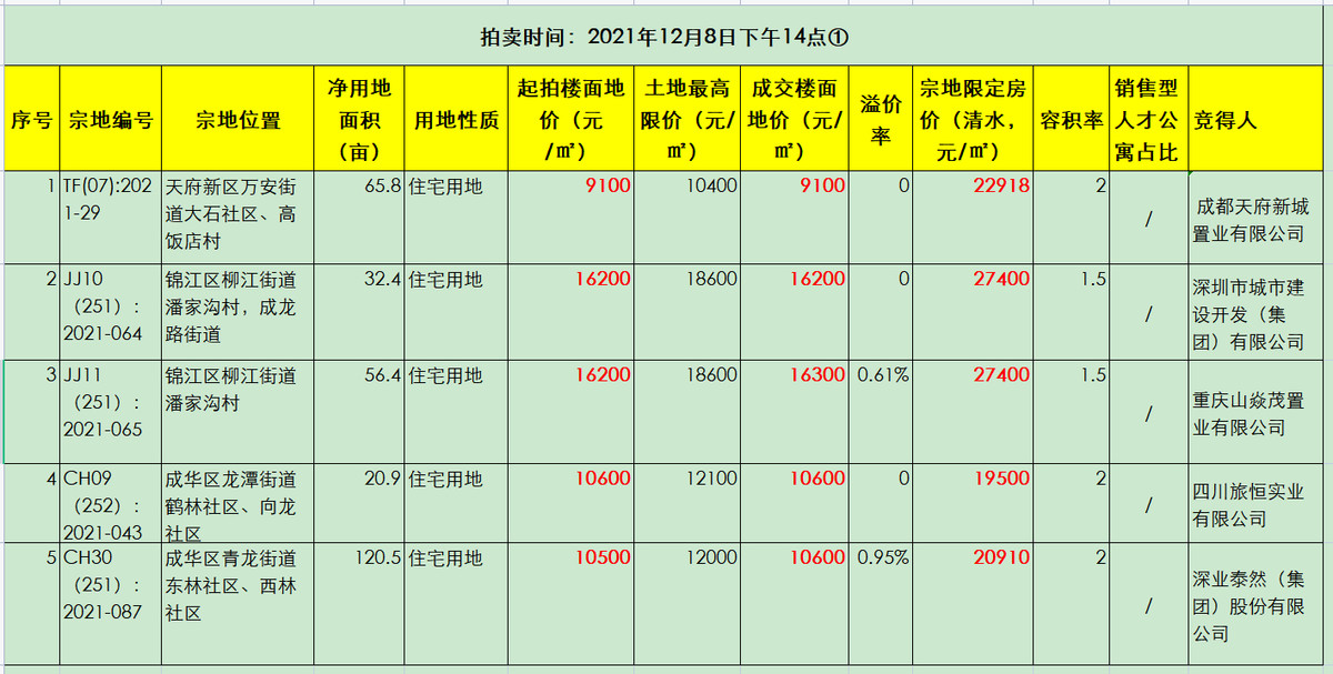 与12月7日2宗龙潭街道地块流拍不同,今天成华区出让的4宗地全部成交,其中2宗达到土地最高限价后续竞销售型人才公寓面积比例,掀起下午土拍的小高潮。