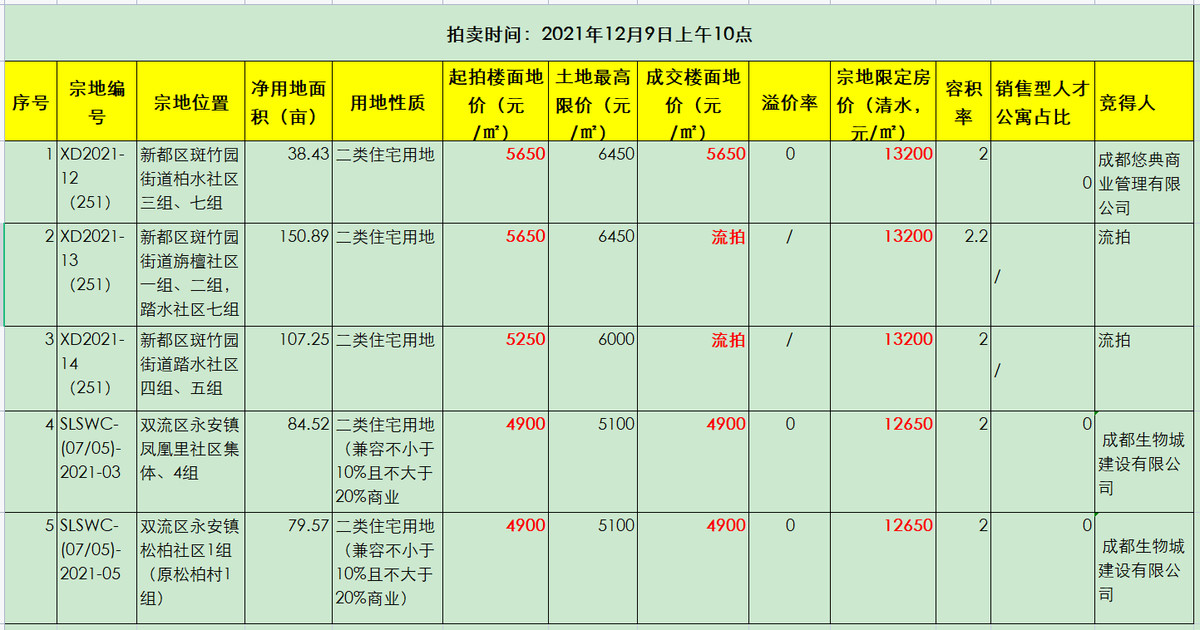 今天(12月9日)成都第三批次集中土拍进入最后一天,这也是今年成都最后一次集中供地。上午十点,来自新都区和双流区的5宗地相继出让,最终3宗地底价成交,2宗地流拍。