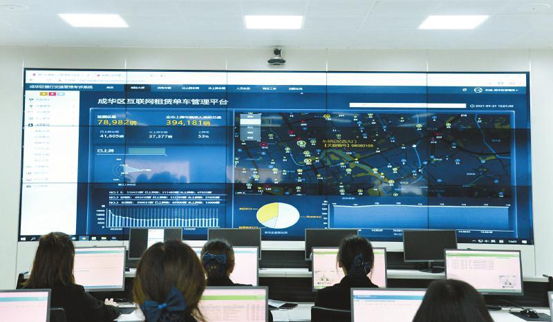 在成都市成华区共享单车序化管理平台指挥中心大厅的显示屏上,实时显示着互联网租赁单车的分布状况。如发现超量,现场管理人员会立即呼叫运营管理团队及时调整,清运超量投放的单车。