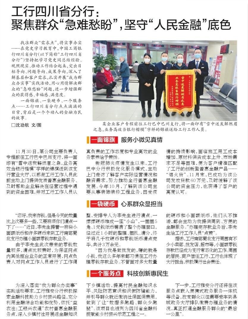 找准群众“需求点”,将实事办实——在党史学习教育中,中国工商银行四川省分行(以下简称“工行四川省分行”)坚持把学习党史同总结经验、观照现实、推动工作结合起来,突出目标导向、问题导向、成果导向,深入了解基层和客户需求,扎实开展“我为群众办实事”实践活动,用心用情解决群众的“急难愁盼”问题,进一步增强群众的获得感、幸福感、满意度。