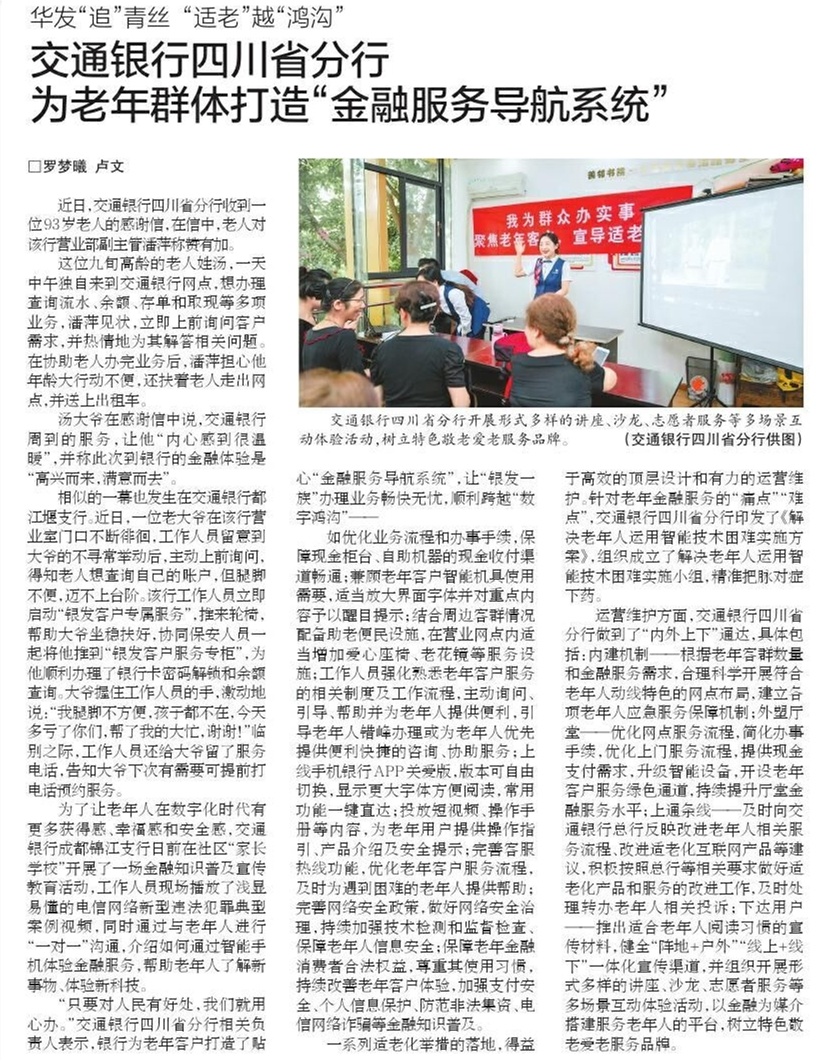 一系列适老化举措的落地,得益于高效的顶层设计和有力的运营维护。针对老年金融服务的“痛点”“难点”,交通银行四川省分行印发了《解决老年人运用智能技术困难实施方案》,组织成立了解决老年人运用智能技术困难实施小组,精准把脉对症下药。