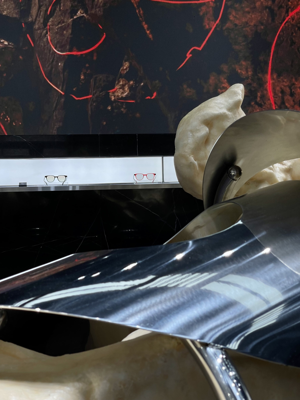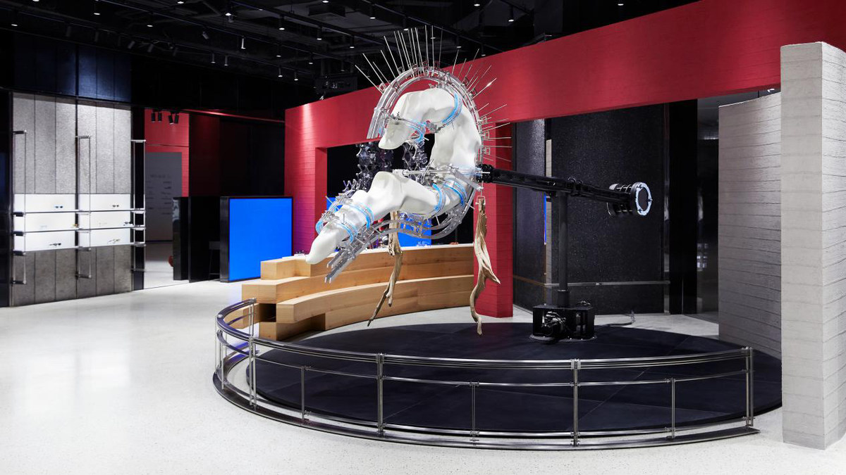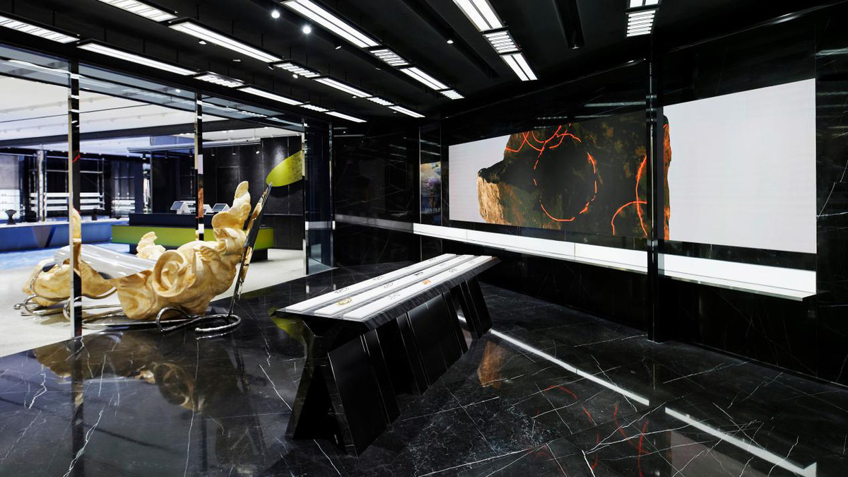 新店共有两层空间,一层空间中最引人注目的是GENTLE MONSTER机器人实验室所创作的大型动力艺术装置,它不断重复着机械的运动,向所有的来访者模拟数据世界里数字被随机提取的过程。