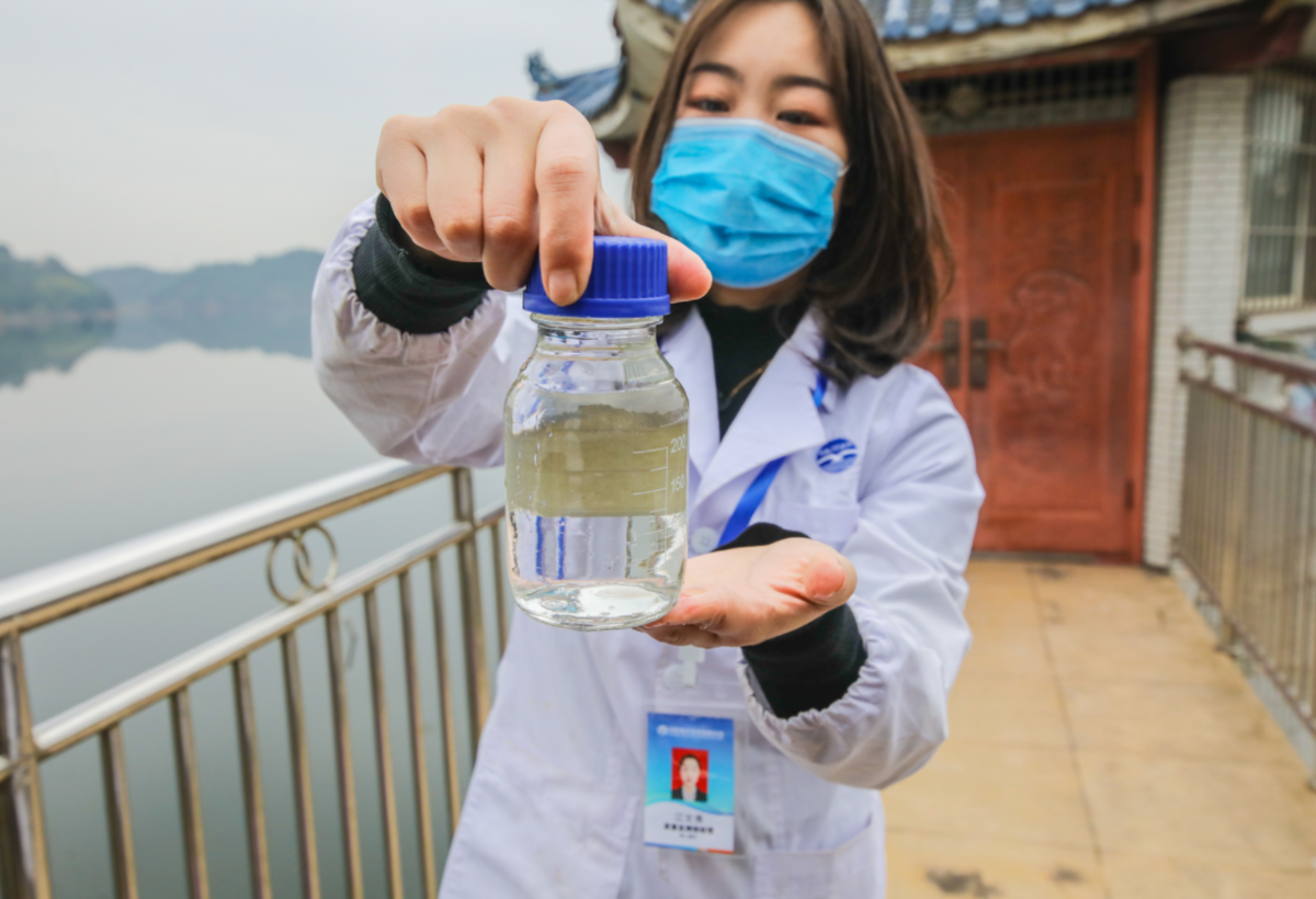 海天股份工作人员展示资阳老鹰水库水源水质。(海天股份供图)