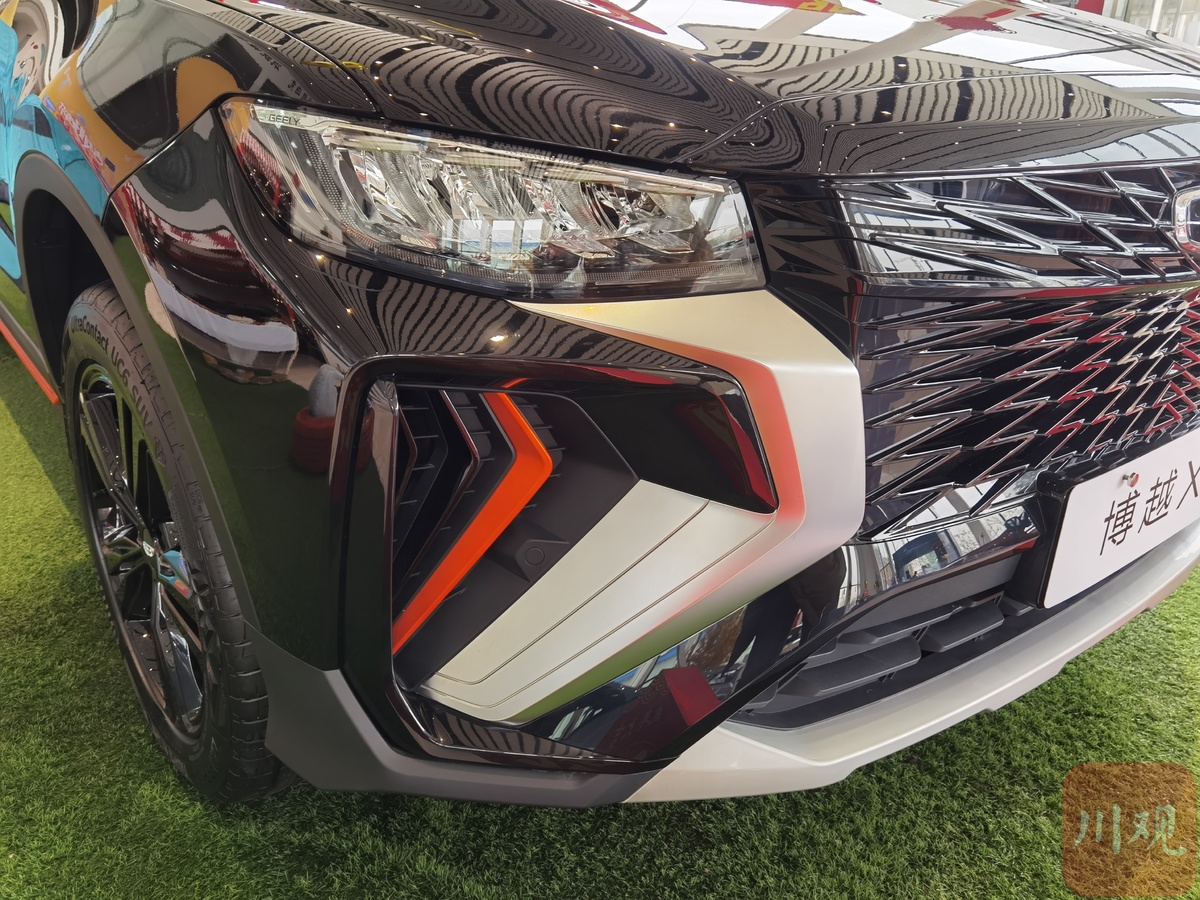 纵观全车,博越的车身动感时尚,亮黑的格栅、轮毂、行李架,整体看起来十分运动。燃动橙套装的点缀,如刀锋般的进气口装饰、箭羽饰条、橙色卡钳,让博越X充满活力。