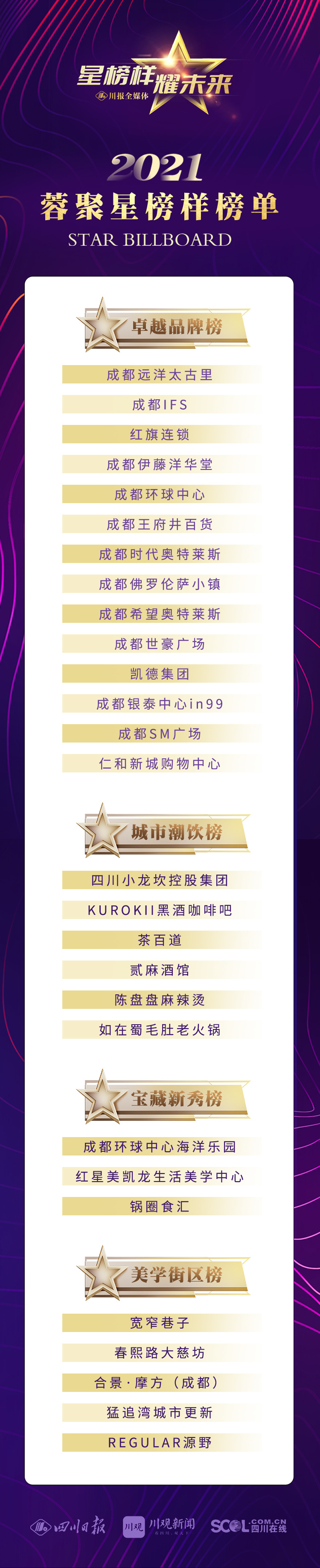 12月23日,以“星榜样,耀未来”为主题,由四川日报全媒体主办的“2021蓉聚星榜样”年度总评活动正式公布系列评选榜单。经过激烈竞选、严格遴选、权威评选,此次年度总评活动共推出“卓越品牌榜”“城市潮饮榜”“宝藏新秀榜”“美学街区榜”四大荣誉榜单,涵盖了购物、餐饮、街区、文旅等多个领域,进一步释放首店经济等带来的发展机遇,助力成都加快建设国际消费中心城市。