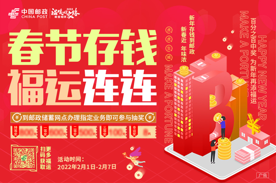 新年存钱到邮政,到邮政储蓄网点办理指定业务即可参与抽奖,为不一样的新年再添特别的福运!