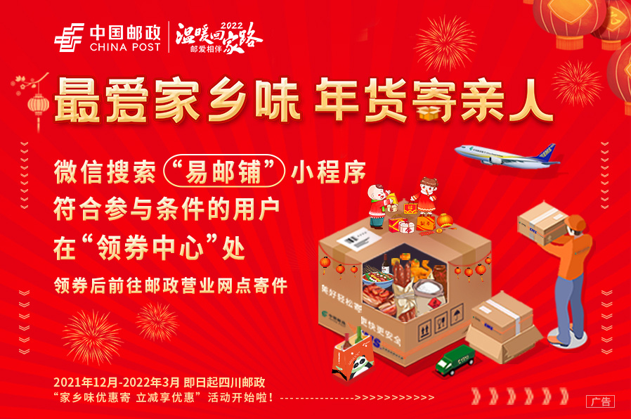 四川邮政开展“最爱家乡味·年货寄亲人”关爱务工人员系列服务活动。即日起至2022年3月,线上关注微信公众号“易邮铺”并进入小程序,符合条件的用户在“领券中心”领取特快专递优惠券,线下在邮政网点办理年货、特色农副产品寄递业务时,享受立减优惠。同时关注“ems中国邮政速递物流公众号”,在对话框回复“优惠”,享受更多寄件权益,最多低至五折。