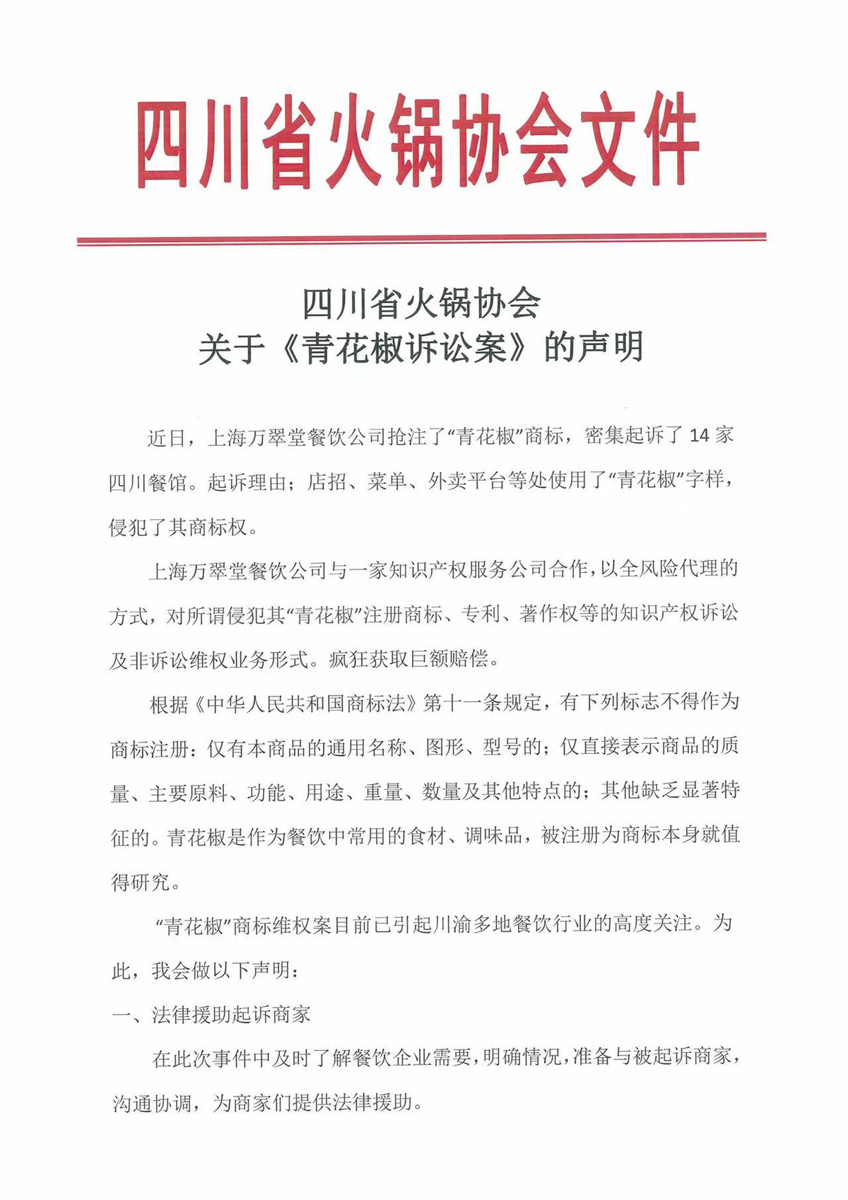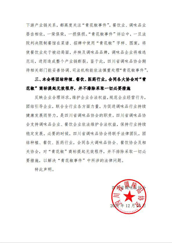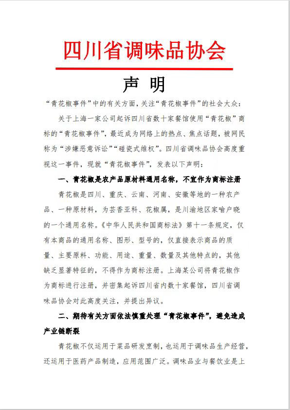 四川省调味品协会发表声明称:青花椒是川渝地区家喻户晓的一个通用名称。上海某公司将青花椒作为商标进行注册,并密集起诉四川省内数十家餐馆,四川省调味品协会对此高度关注,并提出异议。必要的时候,四川省调味品协会将联手法律团队,团结种植、餐饮、医药行业,会同各大调味品协会、餐饮协会及相关协会,对“青花椒”商标提起无效程序,并不排除采取一切必要措施,以解决“青花椒事件”中所涉的法律问题。