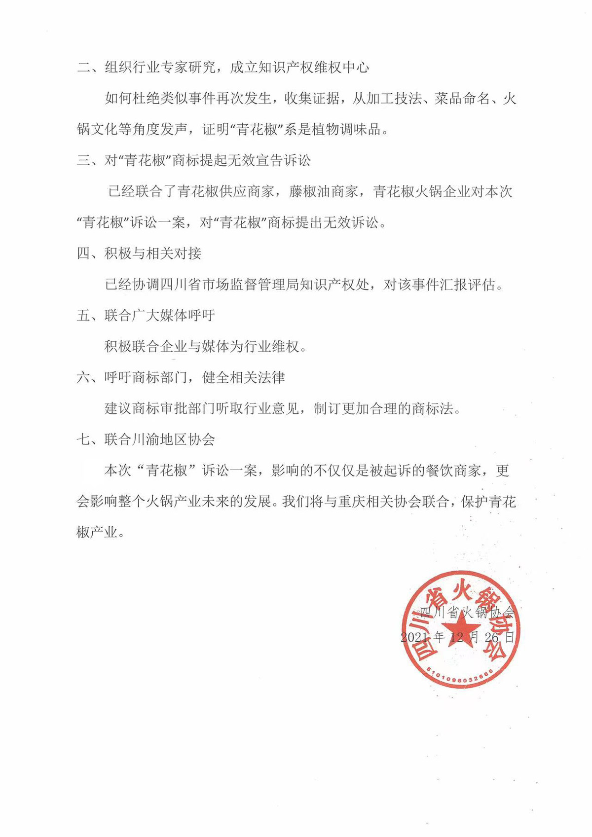 “青花椒”商标维权案目前已引起川内多地相关协会的关注。12月26日下午,四川省火锅协会发表《声明》。声明中称,“青花椒”商标维权案目前已引起川渝多地餐饮行业的高度关注。为此,四川省火锅协会做以下声明:一、法律援助起诉商家;二;组织行业专家研究,成立知识产权维权中心;三、对“青花椒”商标提起无效宣告诉讼;四、积极与相关部门对接;五、联合广大媒体呼吁;六、呼吁商标部门,健全相关法律;七、联合川渝地区协会。