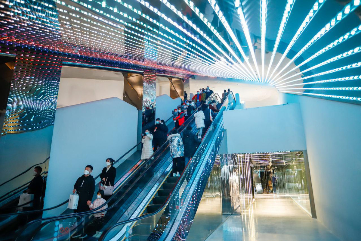 四川在线记者现场看到,数控星光顶面、高流明投影和柔性屏幕、3D参数化设计,科技感十足,让位于负一层的A\B馆交互通道人气高涨。通过通道期间,自拍打卡的时间让人忽略了物理上的距离,通道更可实现对两馆之间进行引流的功能。另据了解,B馆开业期间,位于A馆负一层的远大自有超市——好百客超市销售业绩达到百万元。