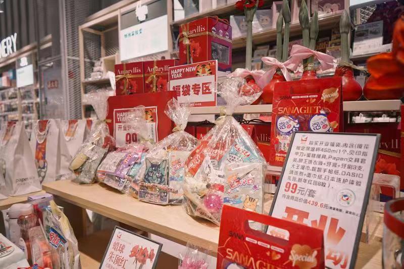 为新店开业专门筹划的开业惊喜食品福袋,含价值270元的精选零食礼包,购买仅需89元;包含樱花保温杯、牙刷、清洁剂等各种品类,价值439元的日式生活好物福袋,购买仅需99元。