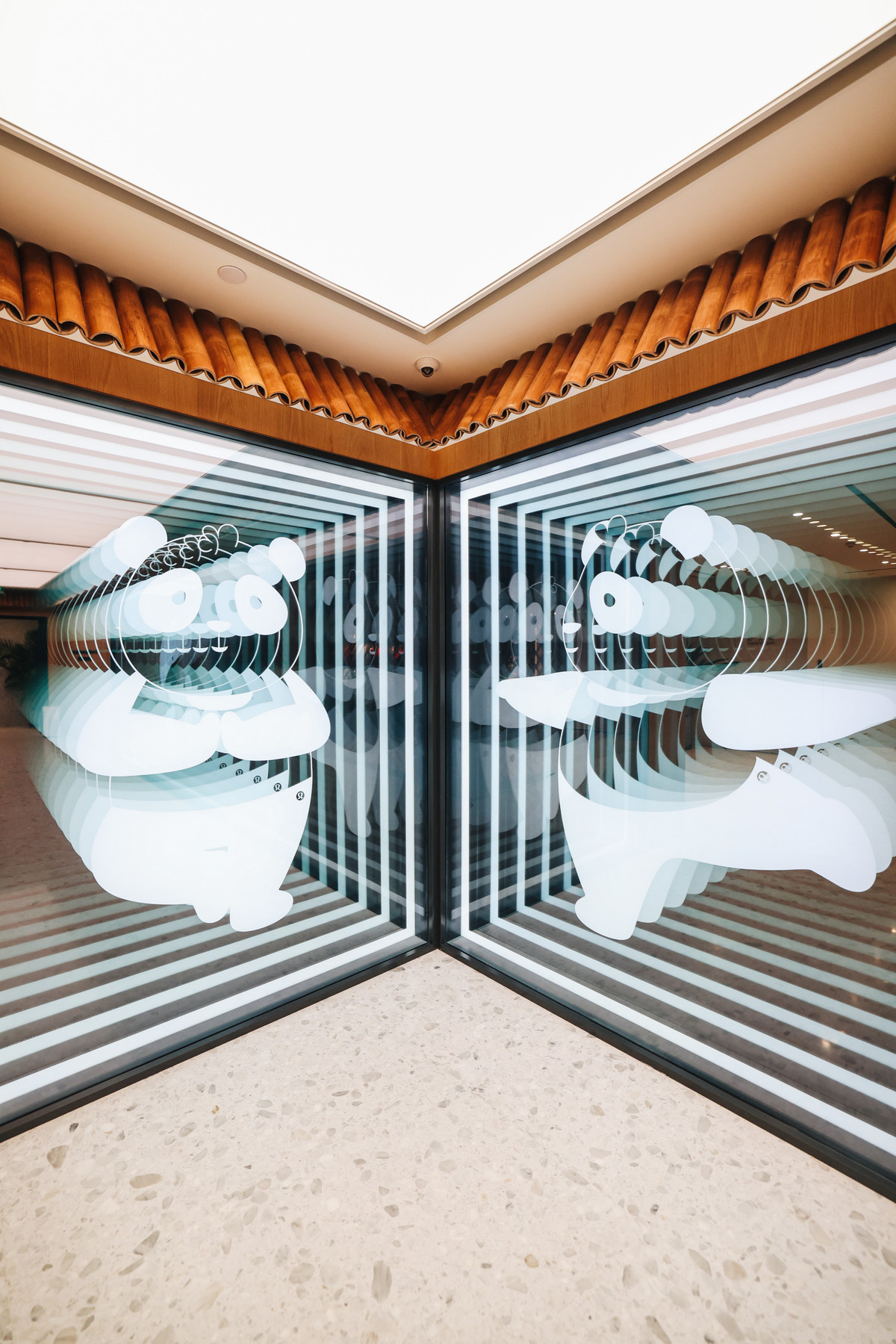 颇为抢眼的是,新店3楼设置了阳光房和露台,运用了大量竹子元素,可承办社区活动。店内整体凸出了“成都”以及“热汗”元素。例如,楼梯侧墙运用lululemon瑜伽砖融合成都方言,颇具趣味;2楼以运动、三星堆、成都美食和熊猫为灵感,创作了一幅“麻将成都”艺术作品。3楼互动墙上,还有五只正在“做瑜伽”的熊猫通过镜面反射效果营造出无数个憨态可掬的熊猫环抱的视觉效果。