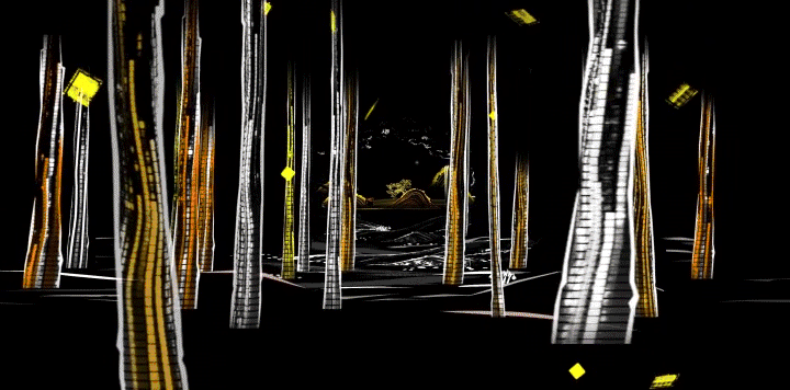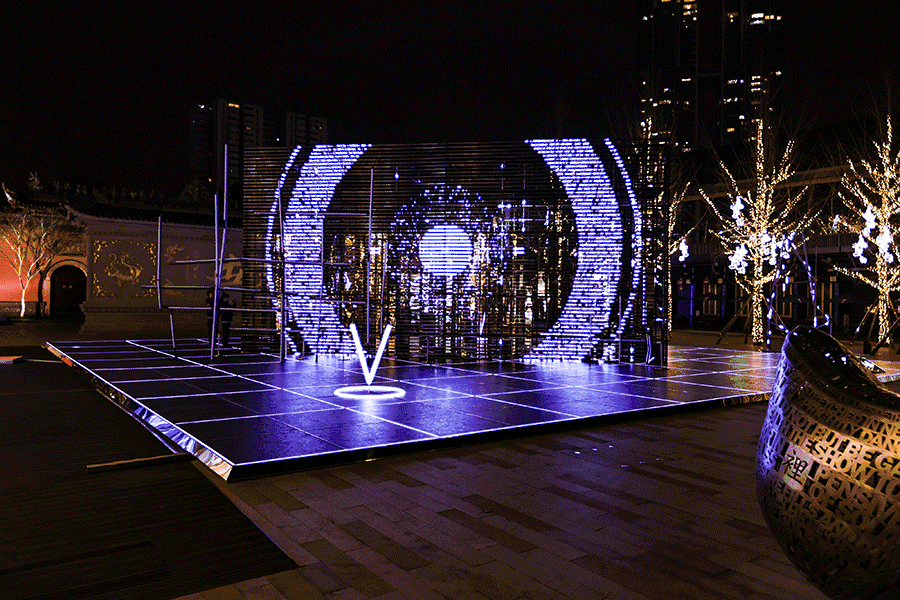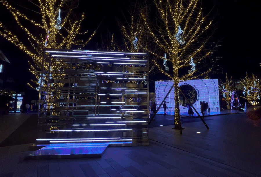 作品充分利用漫广场、中里、东里等开放空间,与环境及置身其中的消费者互动:大量灯柱、灯珠镶嵌在结构、地面、树枝上,协同的灯光编程创造错位质感,营造出宇宙空间被挤压后受到干扰的“故障艺术”。
