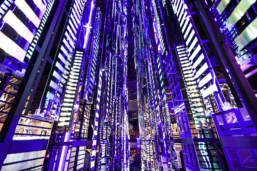 步进“建筑沙丘”,光影流转,异形涡旋浮现,霓虹光彩勾勒建筑丛生的未来城市之景。