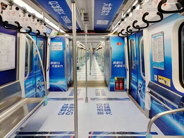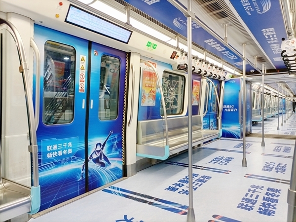 此次地铁专列整体以智慧冬奥元素填充,车厢内深蓝天空与冬奥智慧场馆交相辉映,奥运健儿的飒爽英姿跃跃欲出,车体、地面,均全面覆盖“联通赋能智慧冬奥”、“三千兆服务千家万户”、“5G助力智慧观赛”、“联通5G 大国实力”等文字内容。乘客轻轻抬头,便能感受中国日新月异、显著提升的通信科技成就。中国联通作为北京2022年冬奥会唯一官方通信服务合作伙伴,以5G赋能智慧冬奥的实力,以“手机5G千兆,宽带千兆,全屋智能千兆”服务千家万户的网络品质。
