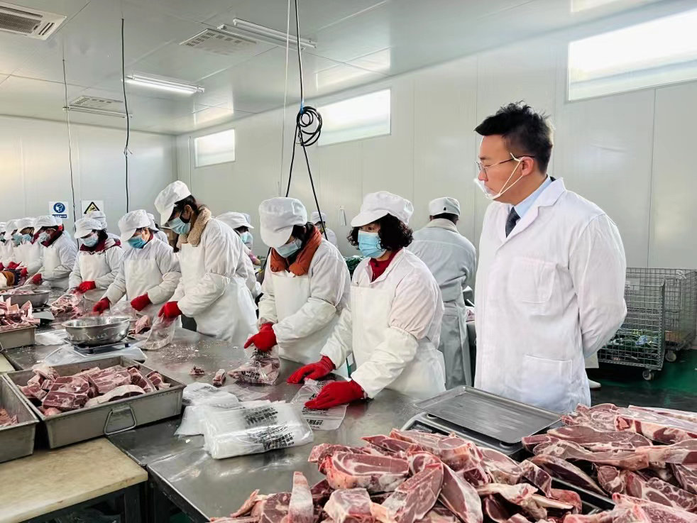 溪源肉联厂的车间里,工人们在流水线上忙碌,周峰(右一)正在现场检查。干得好的工人,拿到了一线城市的待遇。小龙摄