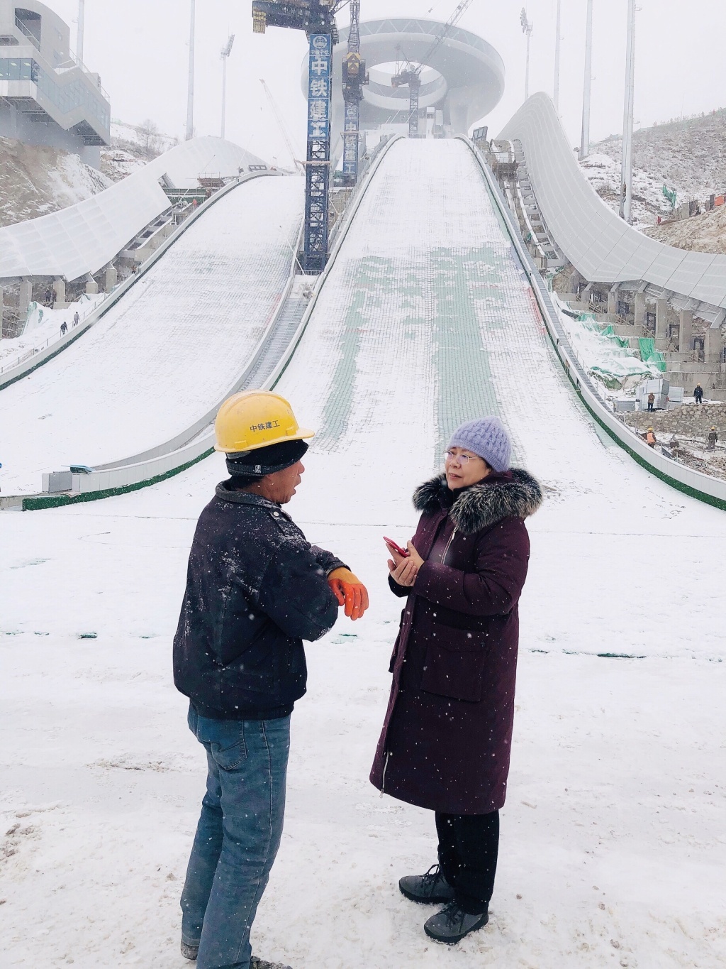 孙晶岩在张家口赛区国家跳台滑雪中心“雪如意”前采访建设者。