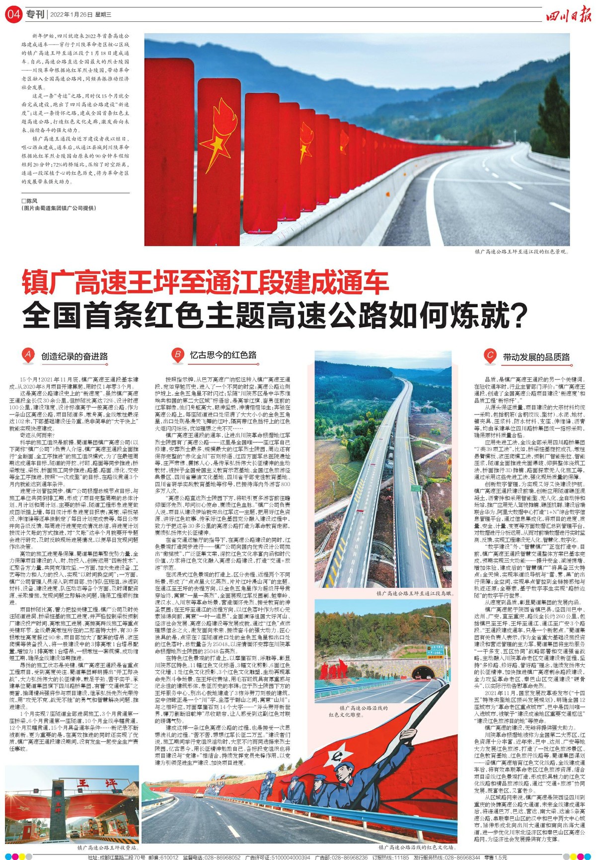 这是一条“奇迹”之路,用时仅15个月就全面完成建设,跑出了四川高速公路建设“新速度”;这是一条情怀之路,建成全国首条红色主题高速公路,打造红色文化走廊,激发面向未来、接续奋斗的强大动力。